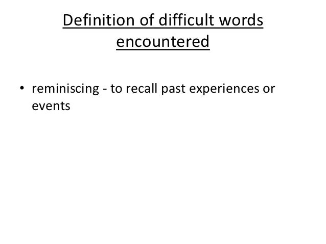 It is a very classy verb used by various poets and people of higher status. Reminisced reminiscing reminisces to think about or tell of past experiences or events. Definition of reminiscing in the idioms dictionary.