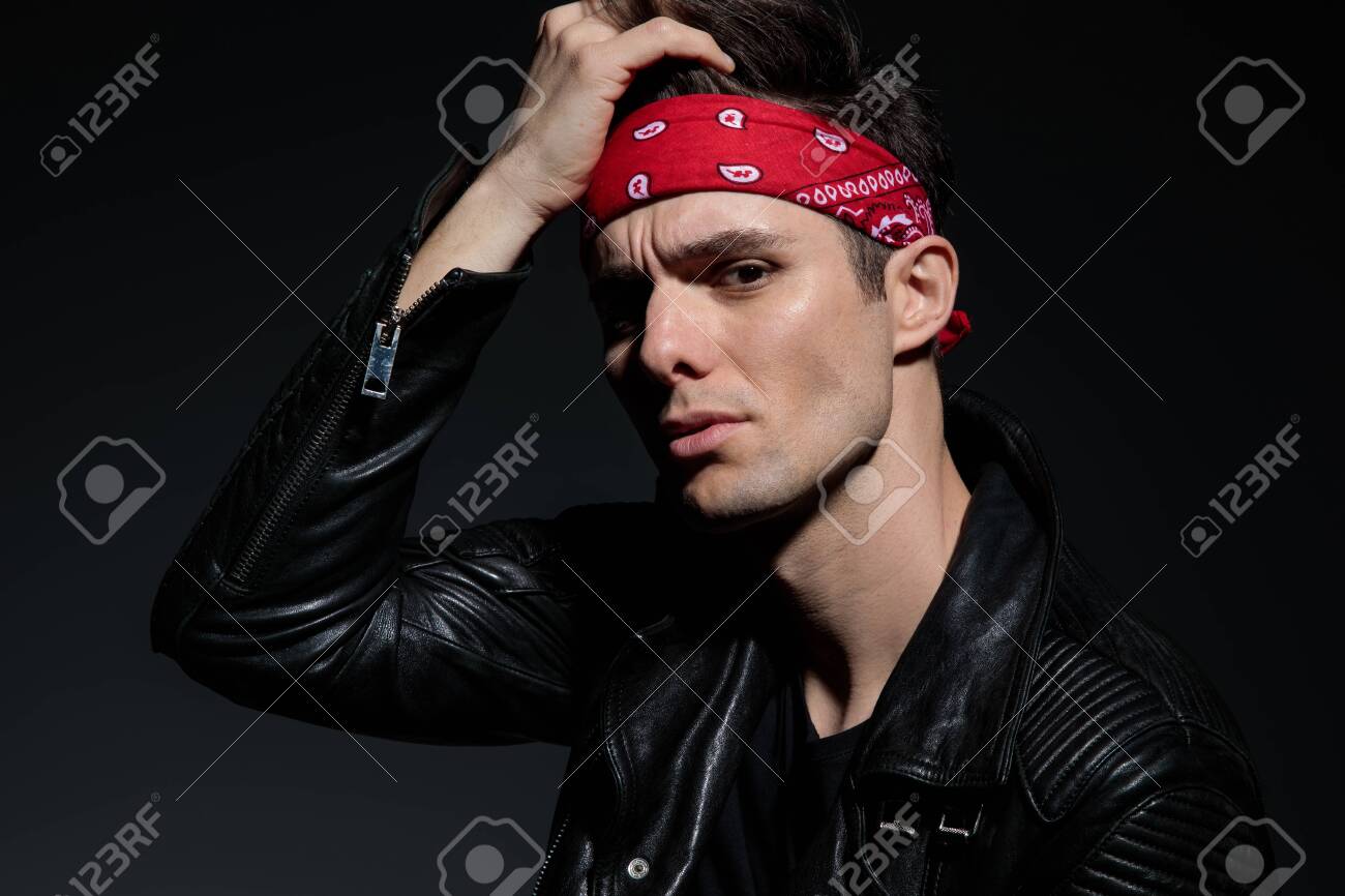Dramatic Young Model Wearing Leather Jacket And Red Bandana And